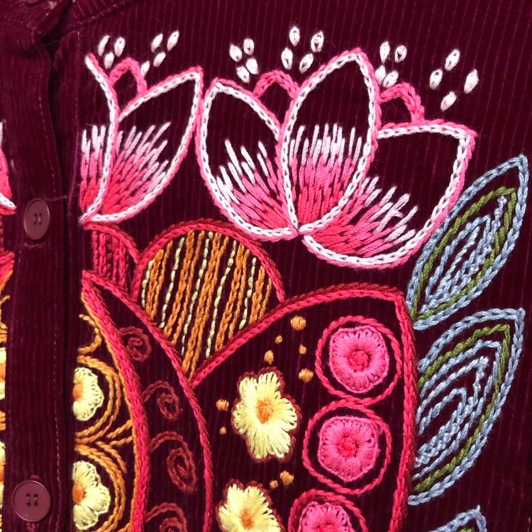 353.コーデュロイ お花の刺繍 ワンピース ボルドー
